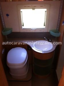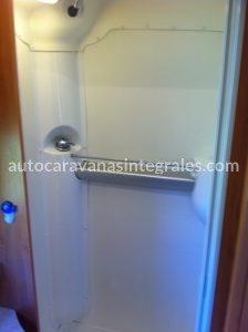 Baño en zona trasera y cabina de ducha independiente con mampara.